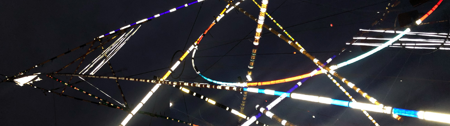 We tautly fixed wire to a circular frame with small plastic cones acting as amplifiers for the individual strings. We also suspended brightly coloured florist tape to a smaller circular frame to create a rhythmic component. The sculpture stood at approx 12m tall, evoking the image of a bamboo pylon or large scale antennae.