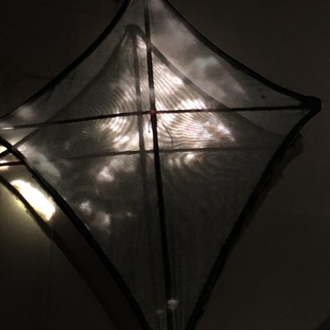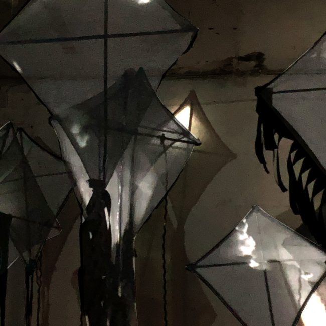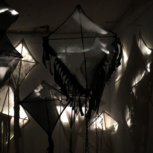 The installation was presented in a darkened room with the kites hung from the ceiling at above head height, with trails that touched the floor.