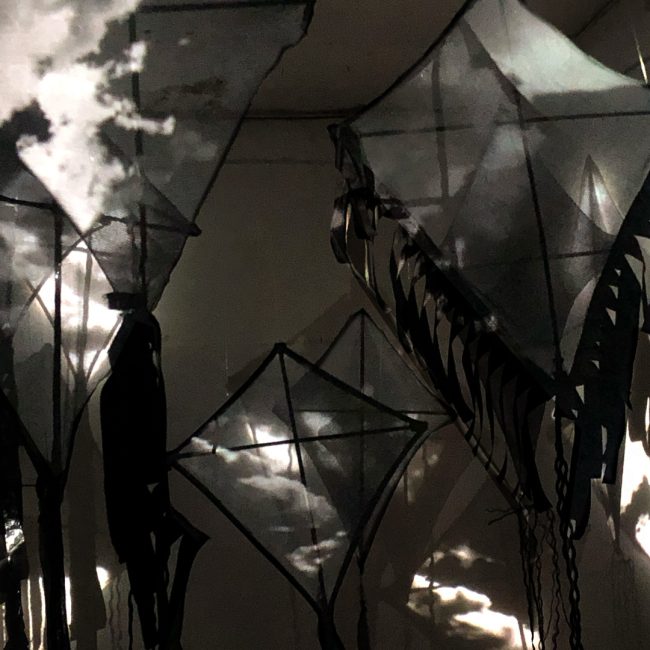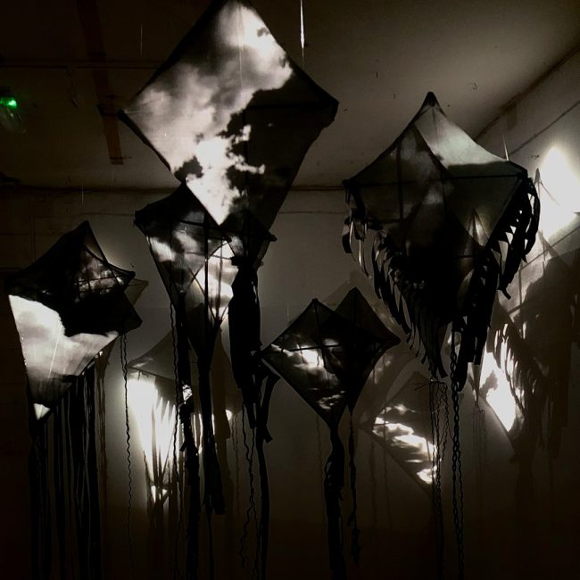 The title of the exhibition was also the theme and our response, ‘Gathering Storms’, featured black kites made from Shark Tooth gauze and fabric remnants which had found footage of moving clouds mapped on to them. The work is a meditation on freedoms and lives that have been lost to war.