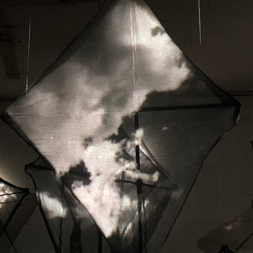 The title of the exhibition was also the theme and our response, ‘Gathering Storms’, featured black kites made from Shark Tooth gauze and fabric remnants which had found footage of moving clouds mapped on to them. The work is a meditation on freedoms and lives that have been lost to war.