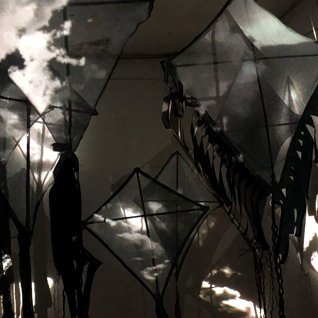 The installation was presented in a darkened room with the kites hung from the ceiling at above head height, with trails that touched the floor.