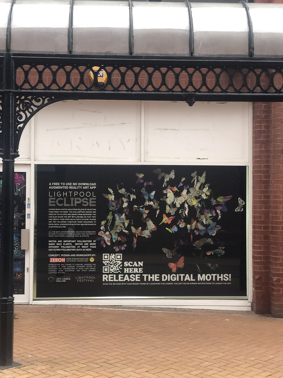In October ’24 we were commissoned by Blackpool’s annual Lightpool Festival to host a series of workshops and to create a bespoke Eclipse App that was advertised at street level, by way of a shop window graphic, for maximum availability and live for the duration of the week long festival which coincides with the world famous Blackpool Illuminations.