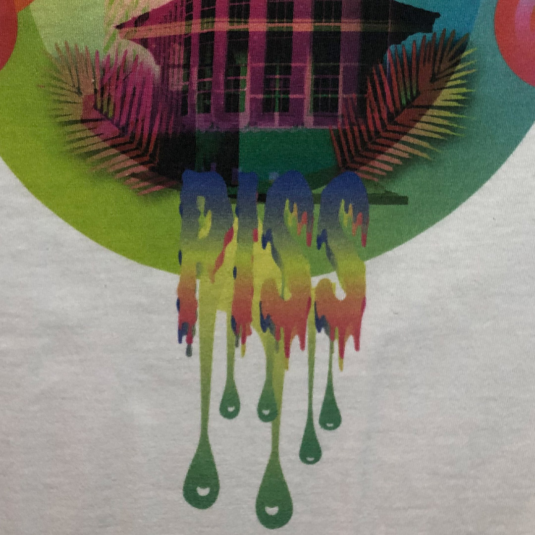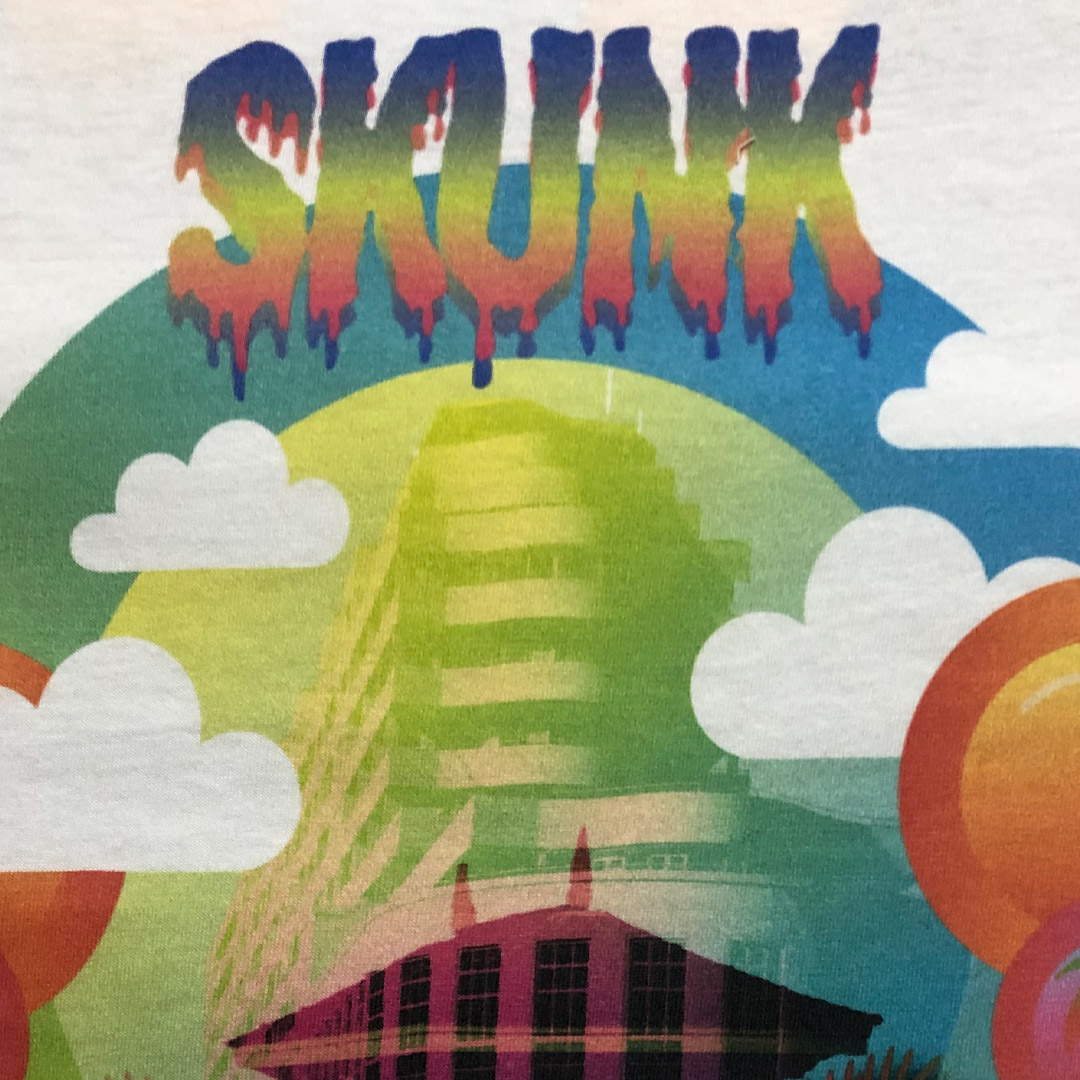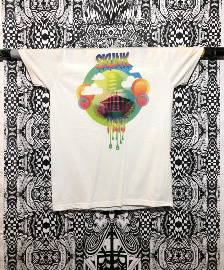 Archive Tshirt from 2017: Digital print on white T, Skunk & Piss is the third of 3 graphics inspired by Ocean Pacific Tshirts of the 1980’s, contradicting the West Coast vibes of the original brand with a nod to the political climate at a time of global instability. This particular graphic refreneces the ongoing ‘gentrification’ of St.Leonards on Sea highlighting seafront aromas and a particular seafront bus shelter in the shadows of the iconic art deco Marine Court building.