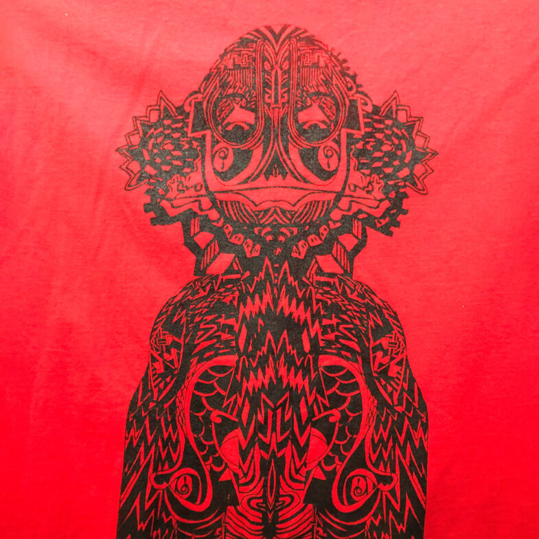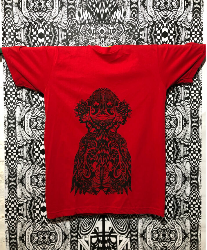 Constructed character from sketch book work by ZEROH printed with plastisol ink on a Pillarbox Red American Apparel T-Shirt. One off edition size M.